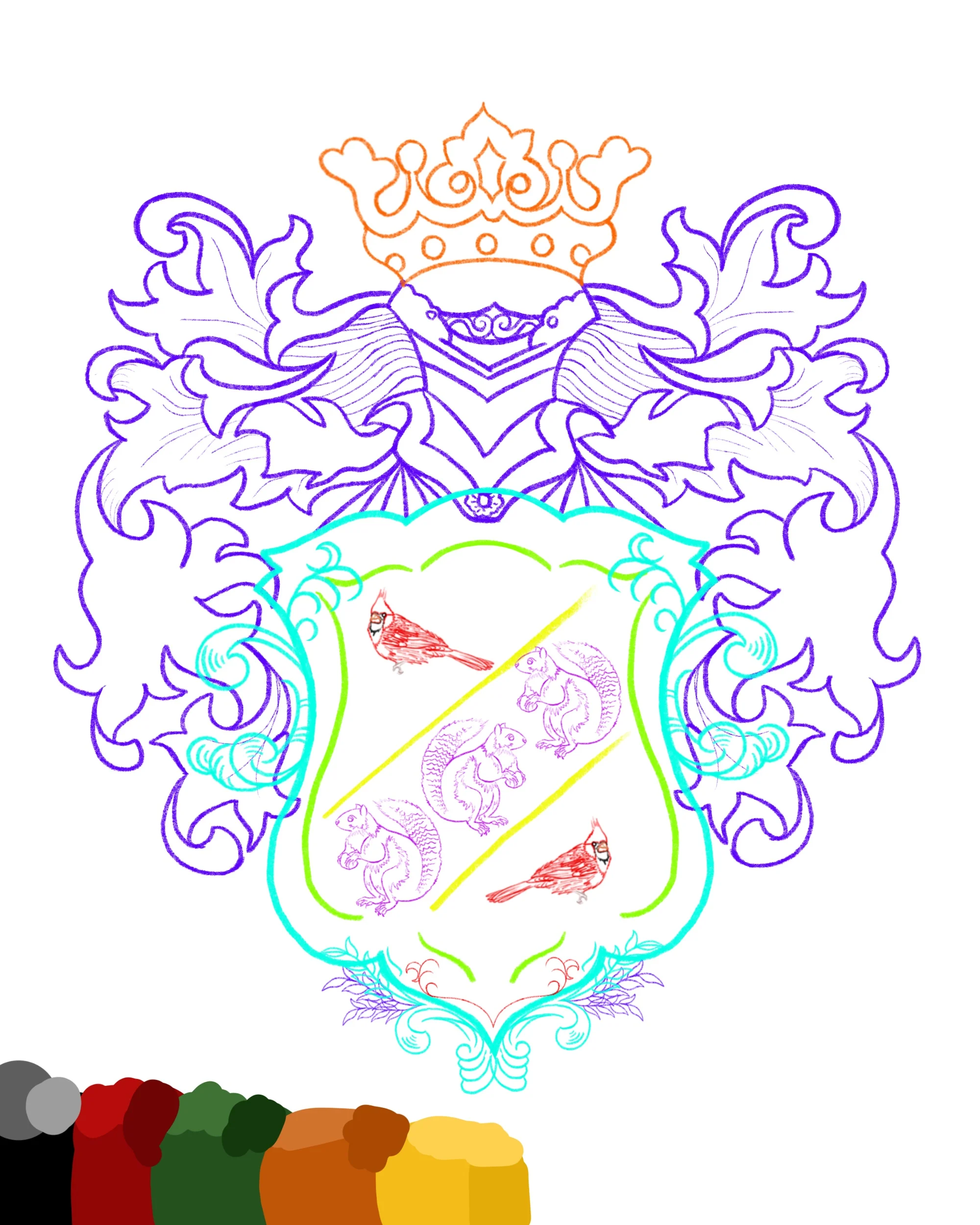 This coat of arms I am making for my Granparents. I am not sold on the squirrel and cardinal, yet. The colors are based off the fact that my Grandpa’s birthday is on Halloween, my Grandma’s birthday is in December and Christmas is spent every year at their house.